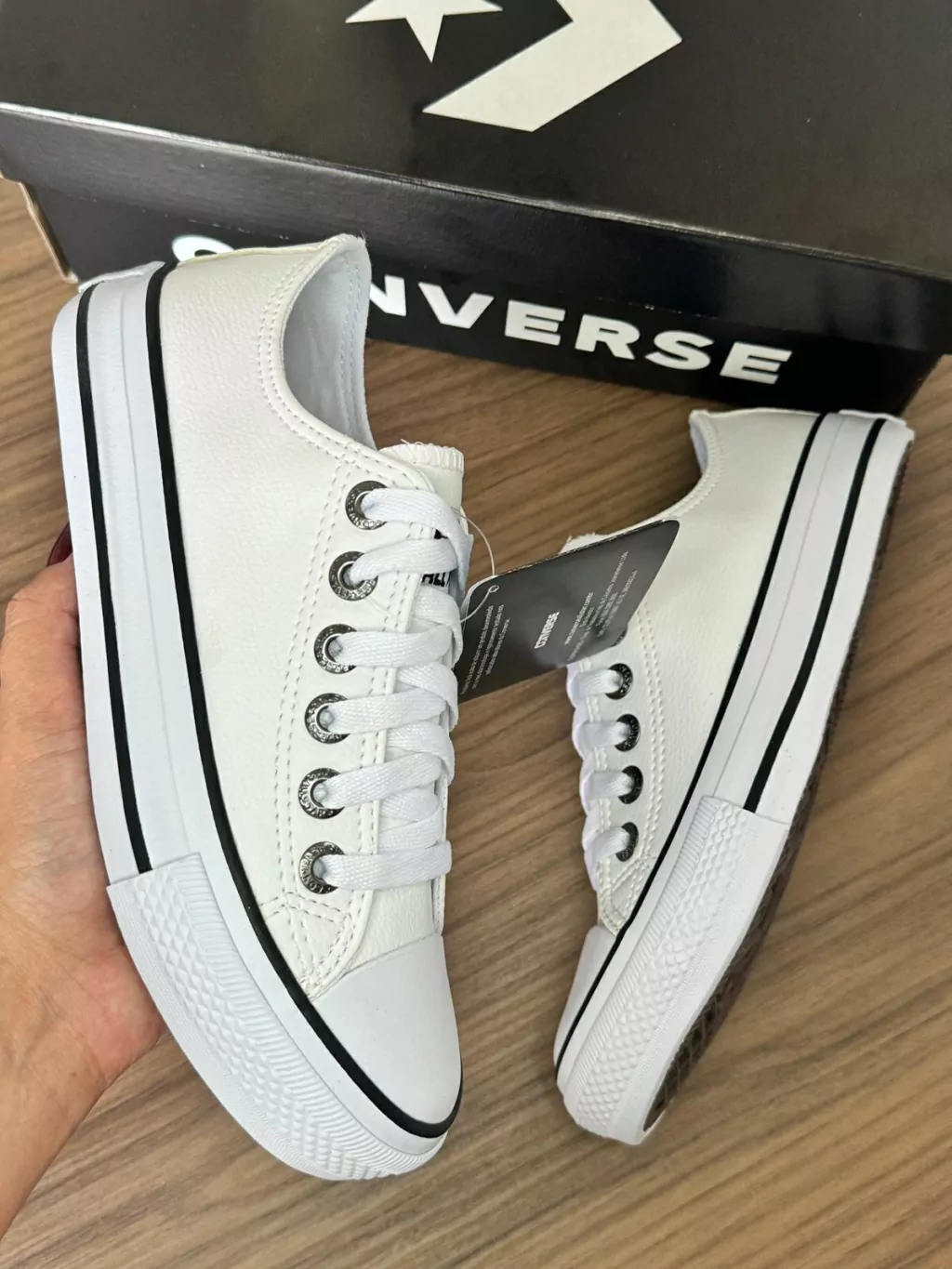 O "All Star Branco Plataforma de Couro sintêtico" é um tênis estiloso e versátil que combina o design clássico e atemporal com uma sola de plataforma branca que adiciona altura e um toque moderno e é uma opção atraente para quem busca um visual moderno e clássico ao mesmo tempo.